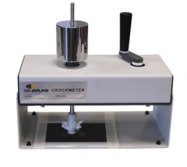 Rotary Crockmeter. To determine the colour fastness of textiles to dry or wet rubbing particularly for printer fabrics. Applies 1134 grams of pressure on a 16mm finger and rotate 1.125 turns clockwise then anti-clockwise. The operating handle is however turned in one direction only.