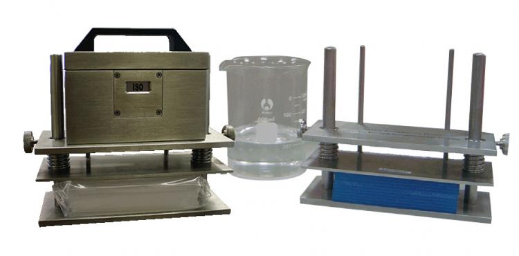 A stainless steel frame with a capacity of 20 samples of 10 cm x 4 cm held between acrylic separator plates, loading weights not included.